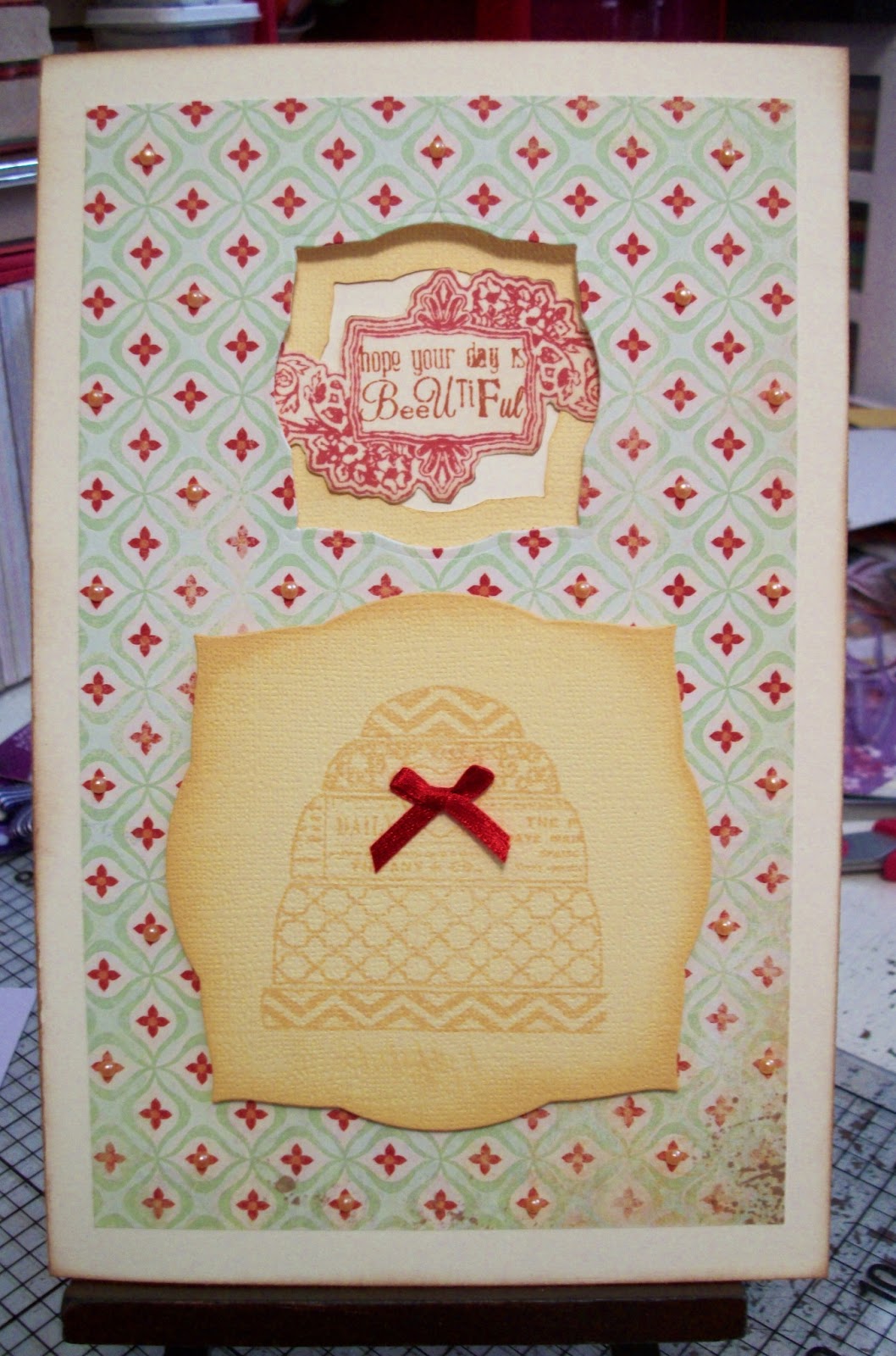 Do you spy new toys? :) Got the Clocks and Homespun dies on Ebay, I believe, for great prices and some others, not shown. I love Ebay! At the right times, of course. ;) I finally got the hexagon dies, that I have wanted for like forever, and a stamp set, but I got them at Artfire(great supplies/prices). I've already made several card bases with them! And I was going to show them to you, but finished cards are prettier so I'll wait. Here is one finished(I think?) card, though: